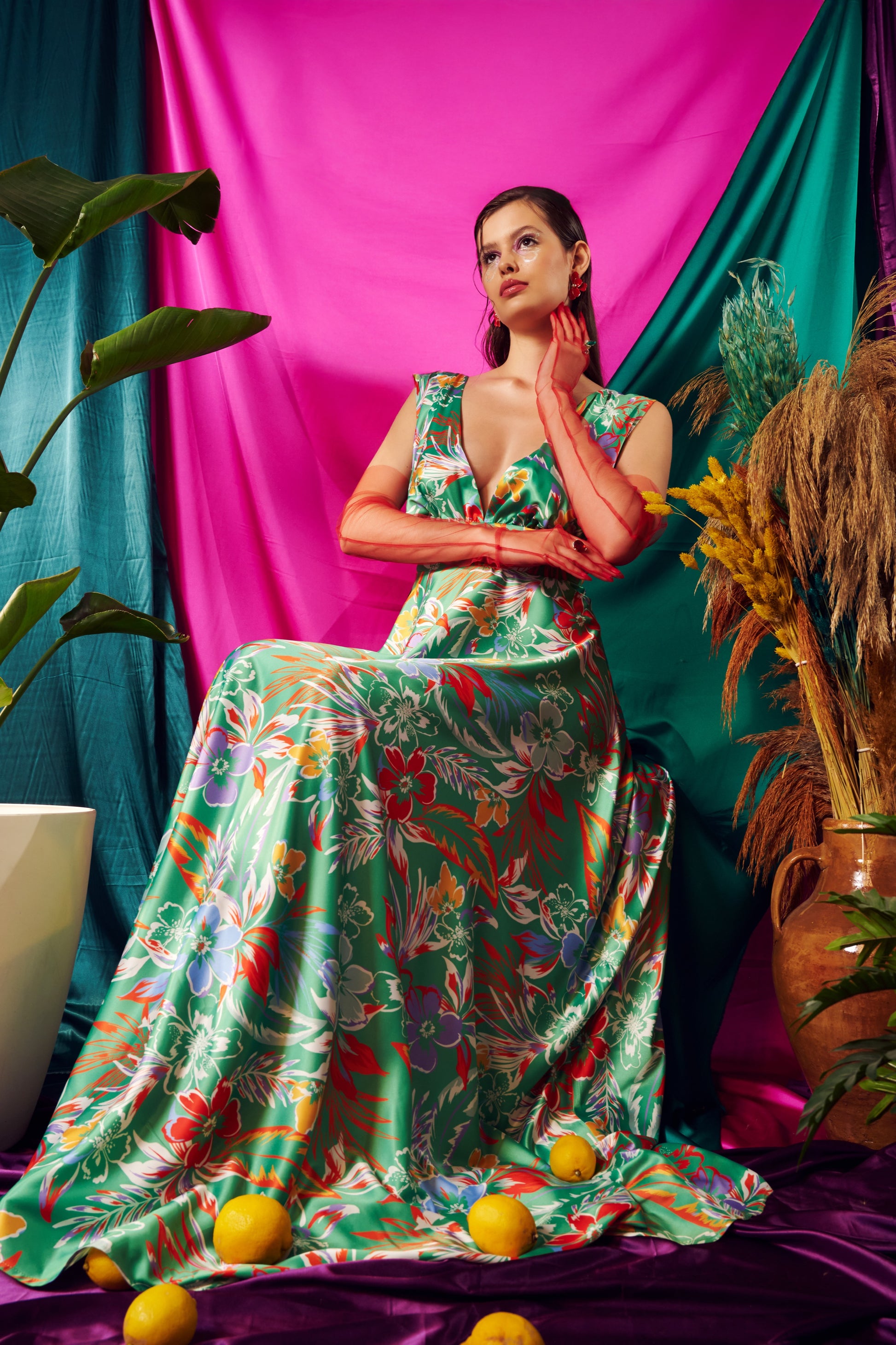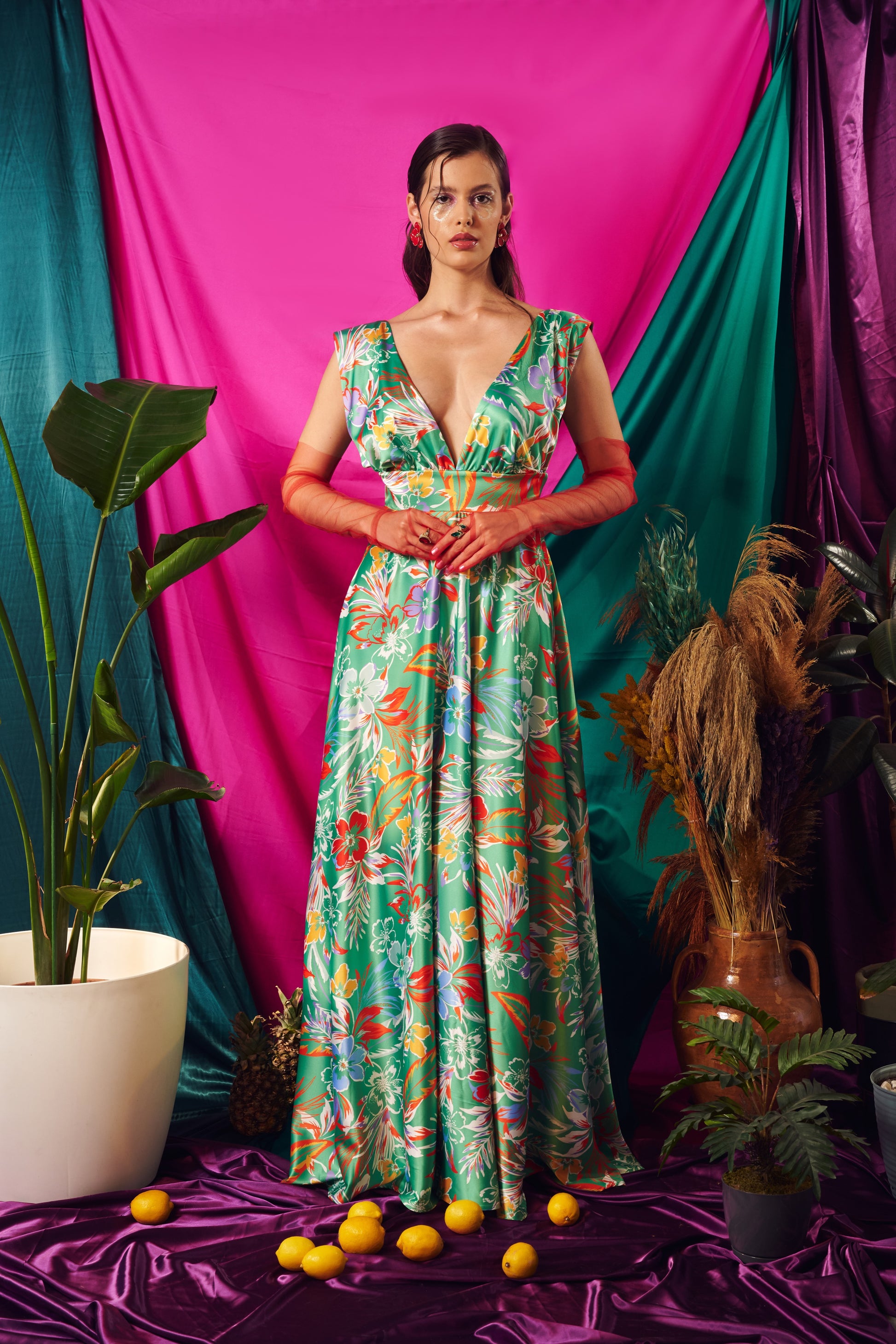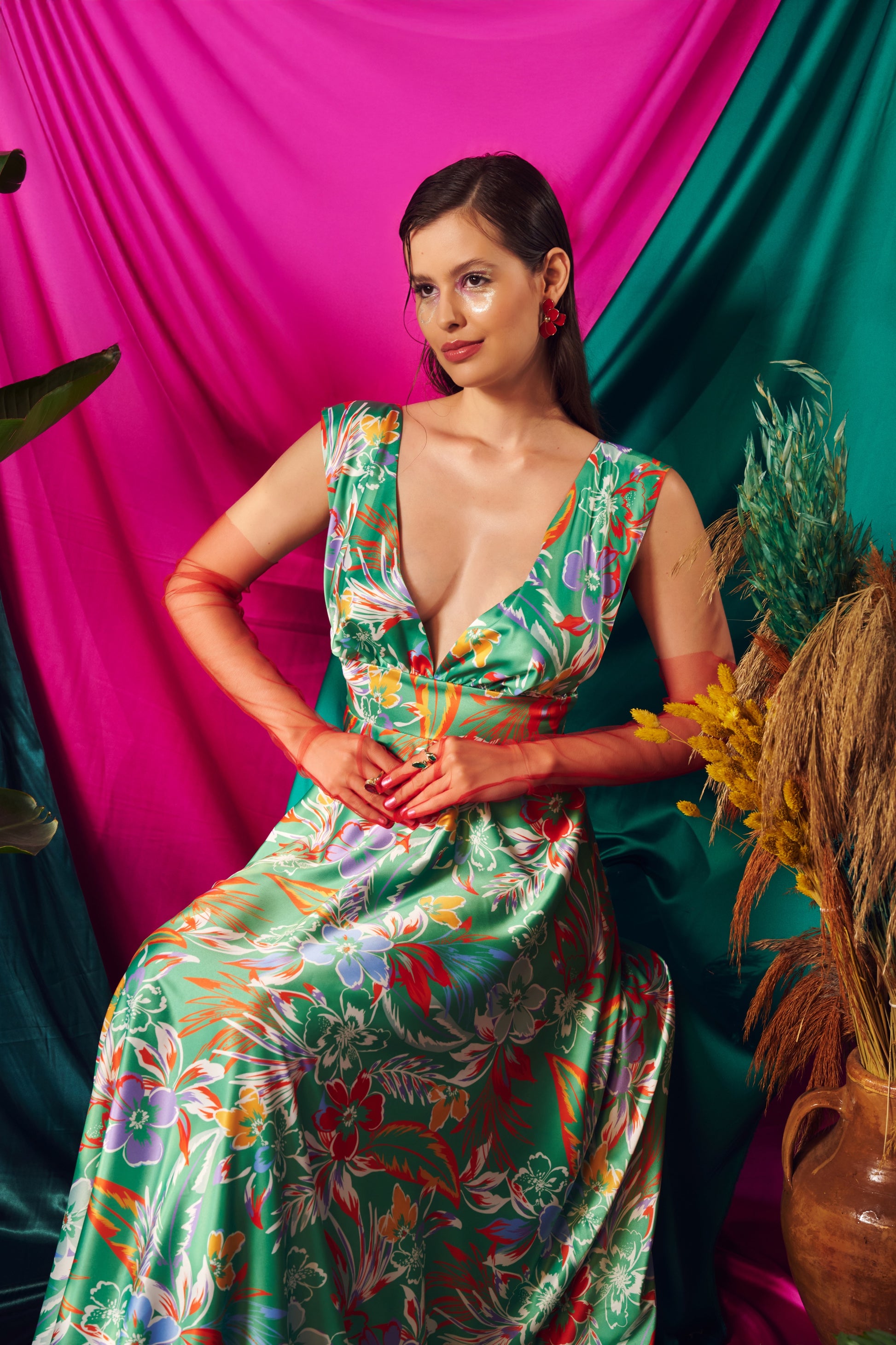 Alba stands between sculpture and ease. A full-length dress with a plunging neckline, broad shoulder structure and a cinched waist — all falling into a fluid, floor-length skirt. The bold tropical motif spreads across the emerald base like a painted canopy, balancing drama with elegance.