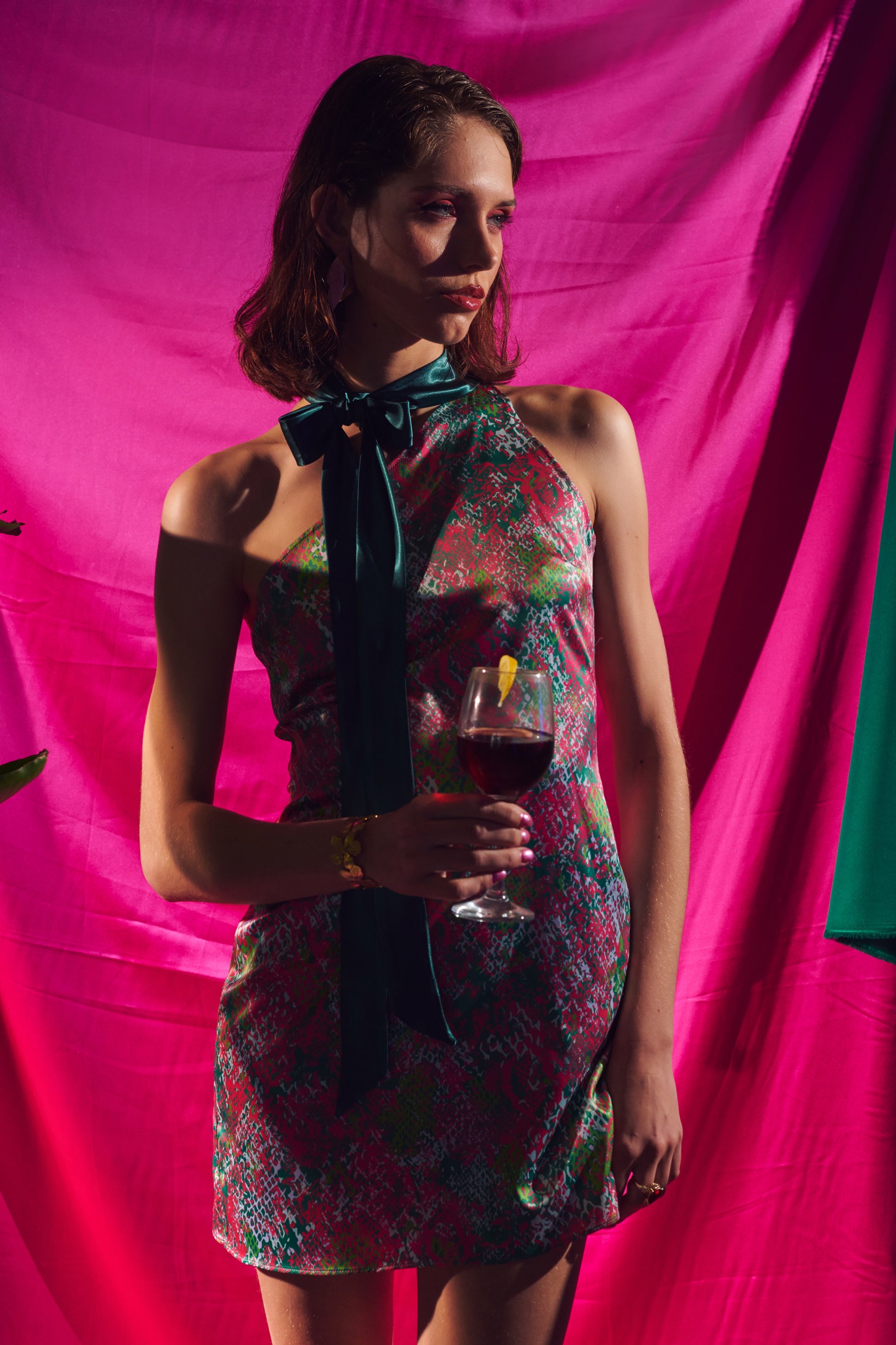 The print — FARREN’s vibrant “Glossy Pink Python” — offers a layered palette of cerise, jade and soft coral, softened by the sleekness of satin. Ideal for summer ceremonies, late-night cocktails, or editorial presence.