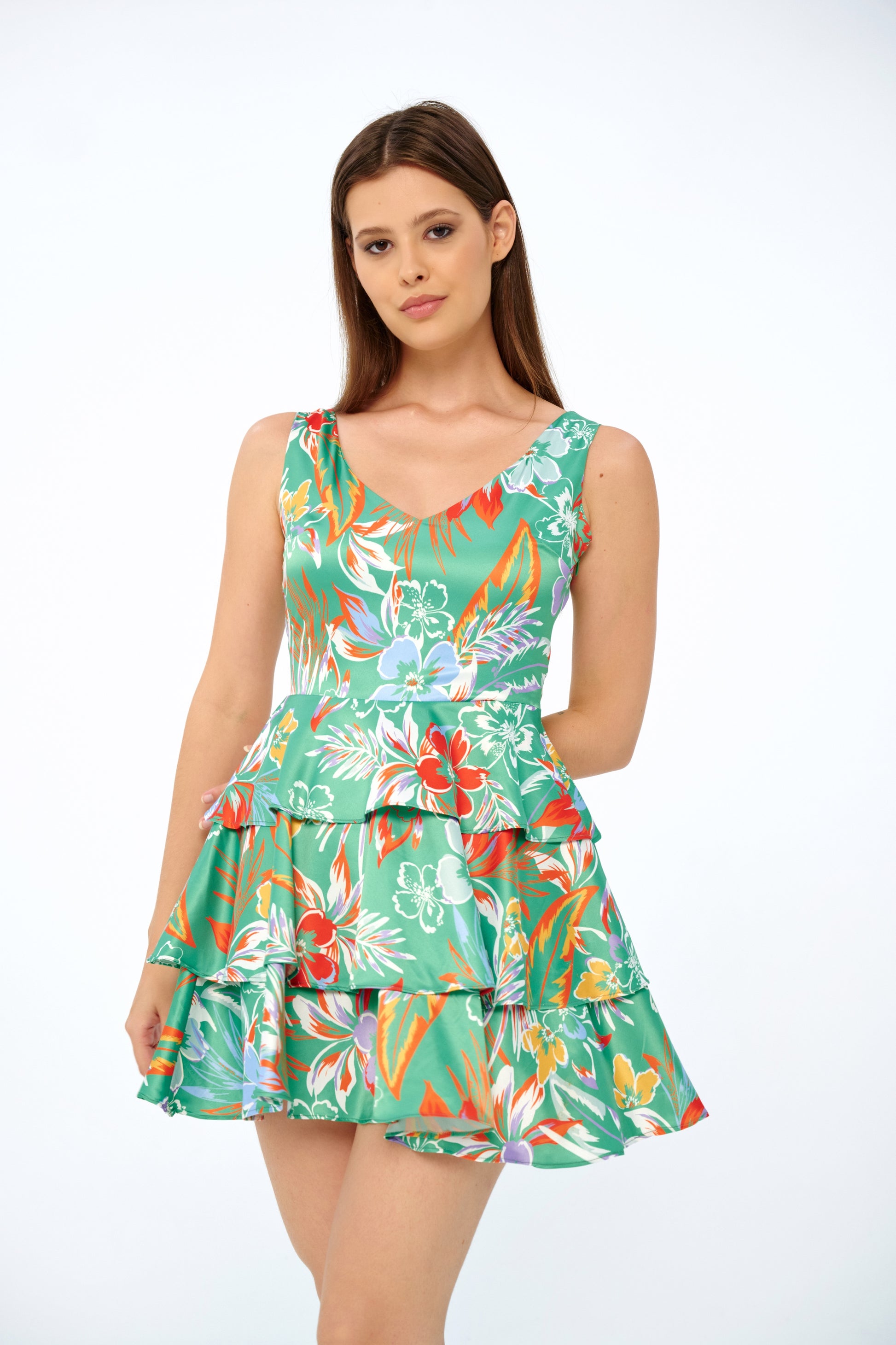 Lucia dances where light touches movement. Cut from a crisp printed satin, this sleeveless mini dress features a soft V neckline and a tiered skirt that creates volume without weight. The fitted waist balances the silhouette, while the layered hem flutters with every step.