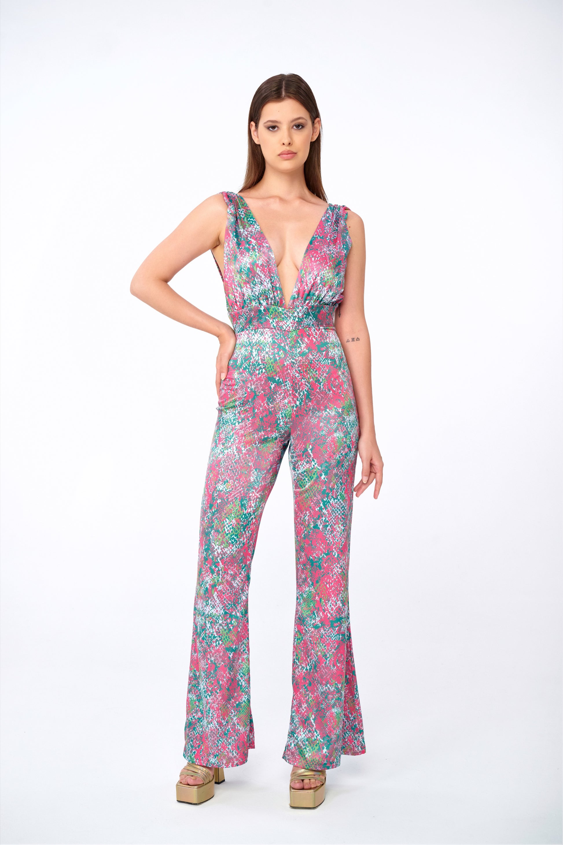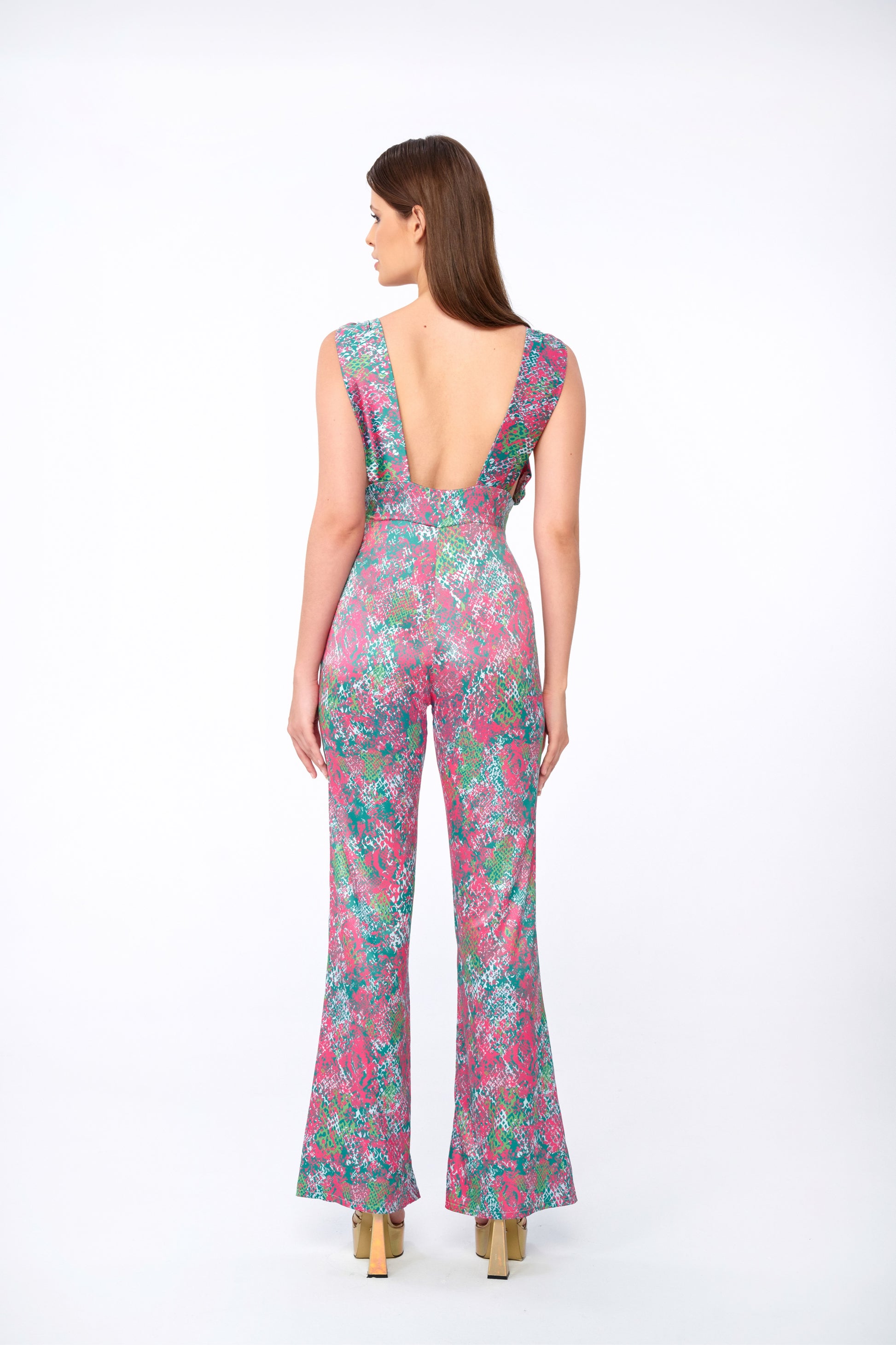 An unapologetically bold silhouette softened by deliberate construction. The Vesper jumpsuit is cut from a fluid satin fabric with a high-gloss, pink python-inspired print — designed to catch the light without demanding attention. The deep V neckline and equally dramatic low back speak to a sense of ease in sensuality, while the wide-leg cut ensures movement without compromise.